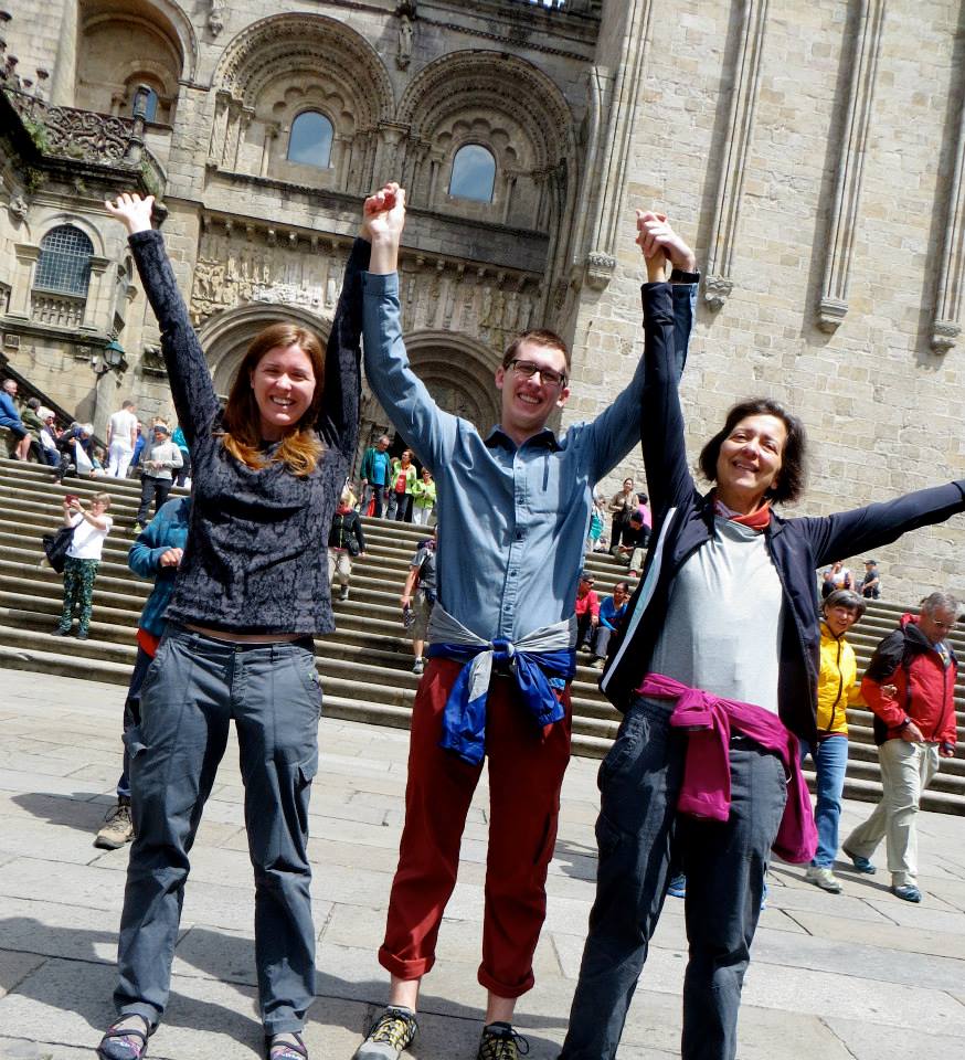 Clare Batty and family celebrating the end of their pilgrimage in front of the Cathedral